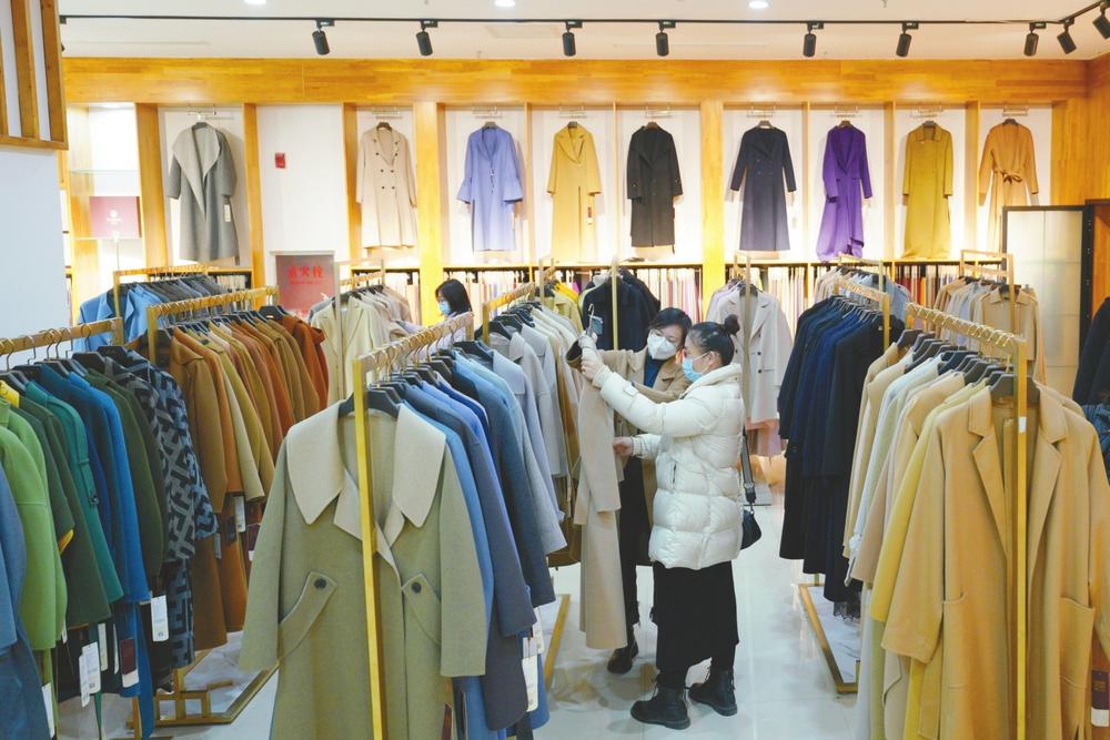 1月4日,顾客在河北省清河县一家羊绒制品店选购羊绒服装。