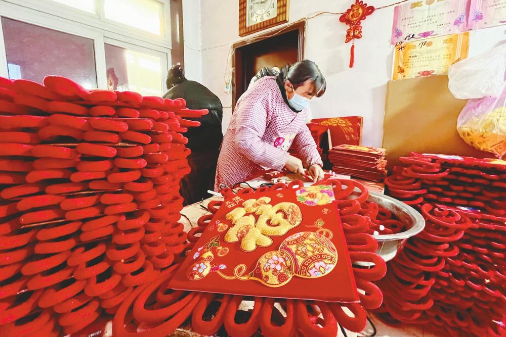 1月4日,在任泽区大屯乡一家年货加工厂,编织工作人员正在紧张忙碌地抓紧编织中国结,供应节日市场,喜迎即将到来的新春佳节。