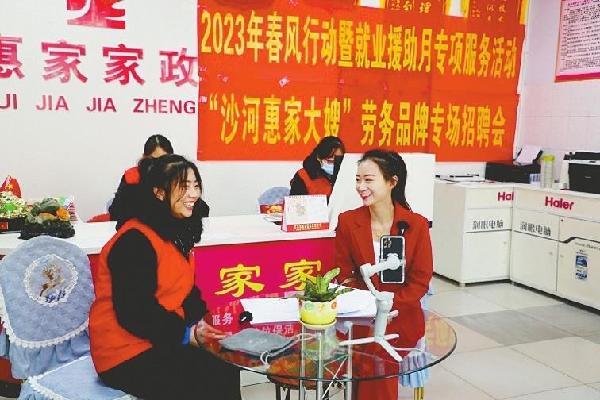 1月10日,沙河市人社局联合惠家家政服务公司举办“春风送真情、援助暖民心”——2023年沙河市春风行动暨就业援助月专场招聘“沙河惠家大嫂”劳务品牌专场招聘会。活动现场发布了家政服务员、钟点工、月嫂、育婴师、医院护工、养老护理员等工作岗位23个,月薪最高可达1万元。最终,28人达成就业意向,线上直播间点击量达1万人以上。