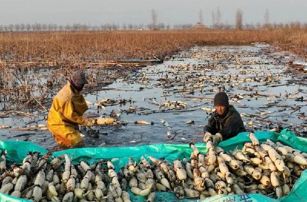 ↑图 在新河县新河镇白穴口村莲藕种植基地,农民冒着严寒采挖莲藕,“千亩藕塘”却是一派火热的抢收场面。(杨世尧 摄)