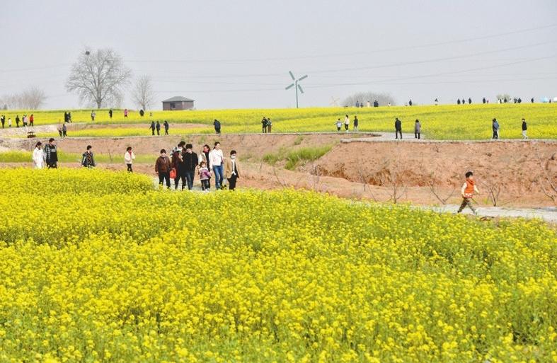 3月26日,游客在沙河市十里亭镇金沙河红薯岭景区油菜花田间游玩。