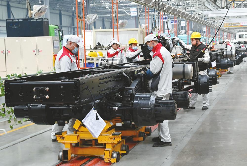 近日,在河北长征汽车制造有限公司总装车间内,工人正在组装新能源重卡零部件。