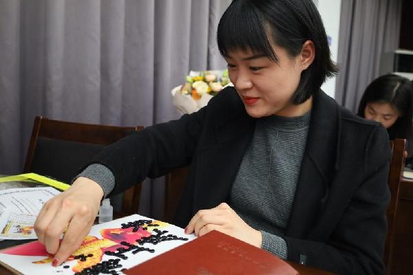 女干部将一粒粒纽扣粘贴到廉洁画作上。 郑丽珠摄