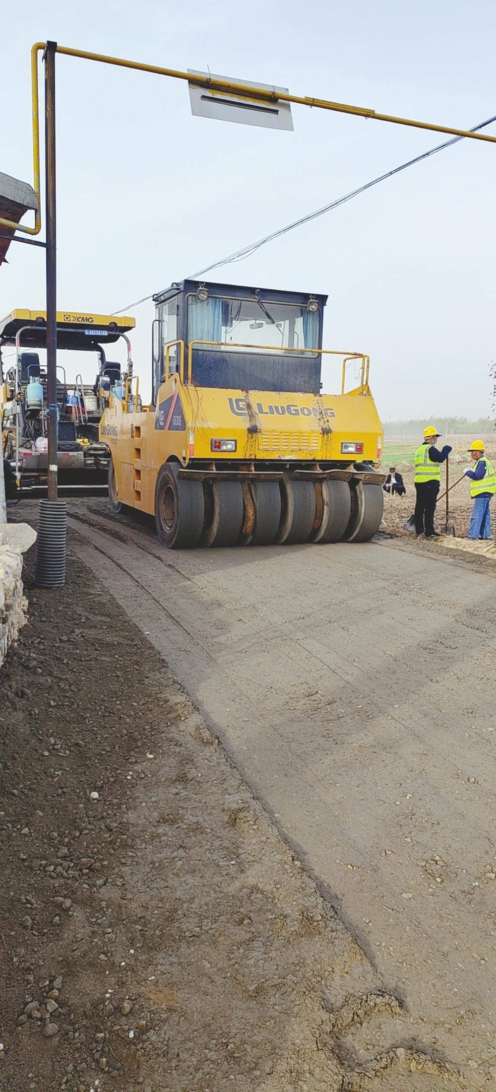 抢工期、赶进度,在沙河市白塔镇东下河村的“四好农村路”施工现场,一台大型机械、十几名工人正在多点作业,进行混凝土浇筑、路基调平压实、路面收面养护工作。