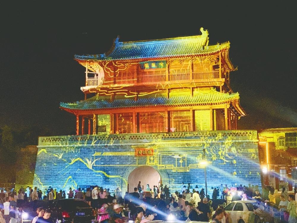 6月10日20时35分,夜幕降临,清风楼的楼体被投影的灯光照亮。在纷纷飘落的烂漫杏花中,张果老倒骑毛驴的图案出现在楼体上。随着灯光变幻,配合音乐与解说,邢台八景一一展现在了清风楼楼体之上,吸引了许多游客前来观赏。