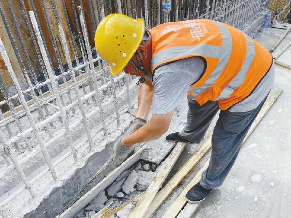 当天,他们正进行筏板基础模板拆除及养护施工。随着手枪钻的阵阵响声,一个个固定模板的对拉螺栓被拆掉,随后,再用撬棍用力拆掉模板……不一会儿,他们额头上便渗出了汗珠,汗水将短袖湿透,但手中的活却没停下。