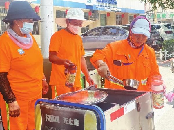 王现枝介绍,高温天气中,他们队每天会给大家送两次绿豆汤,工人们采取错时保洁的方式工作,12时30分到15时休息。“也不是一成不变的,我们还会根据天气情况,随时调整休息时间。”王现枝说。