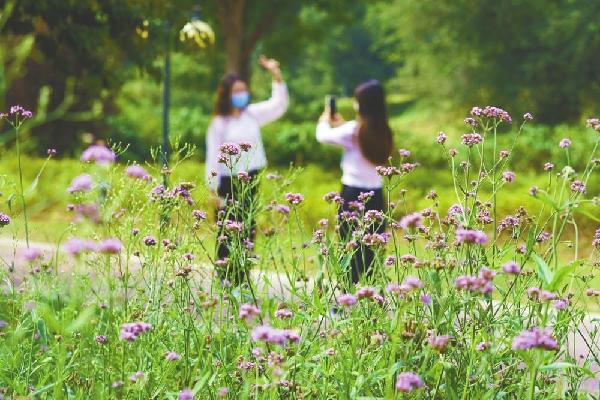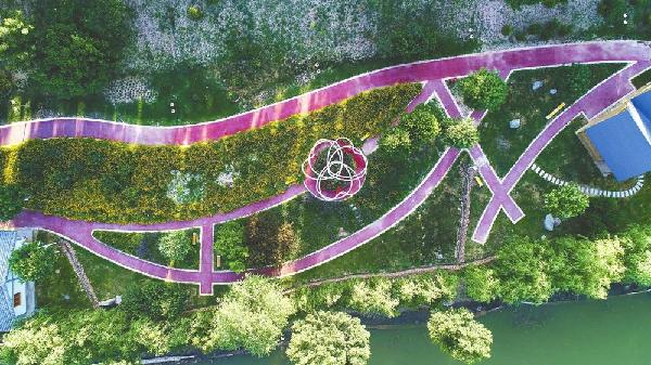 河道走势蜿蜒,两岸地形起起伏伏。放眼望去,一路尽是芳草茵茵、繁花似锦。夕阳西下,婷婷玉树引倦鸟来归,唯有不知疲惫的夏虫与蛙儿依旧叫个不停,似乎想要永远留住这明媚时光。微风吹拂下,花草树木瞬间灵动了起来,与碧波荡漾的河水相映成趣,一幅优美的山水画卷跃然眼前。