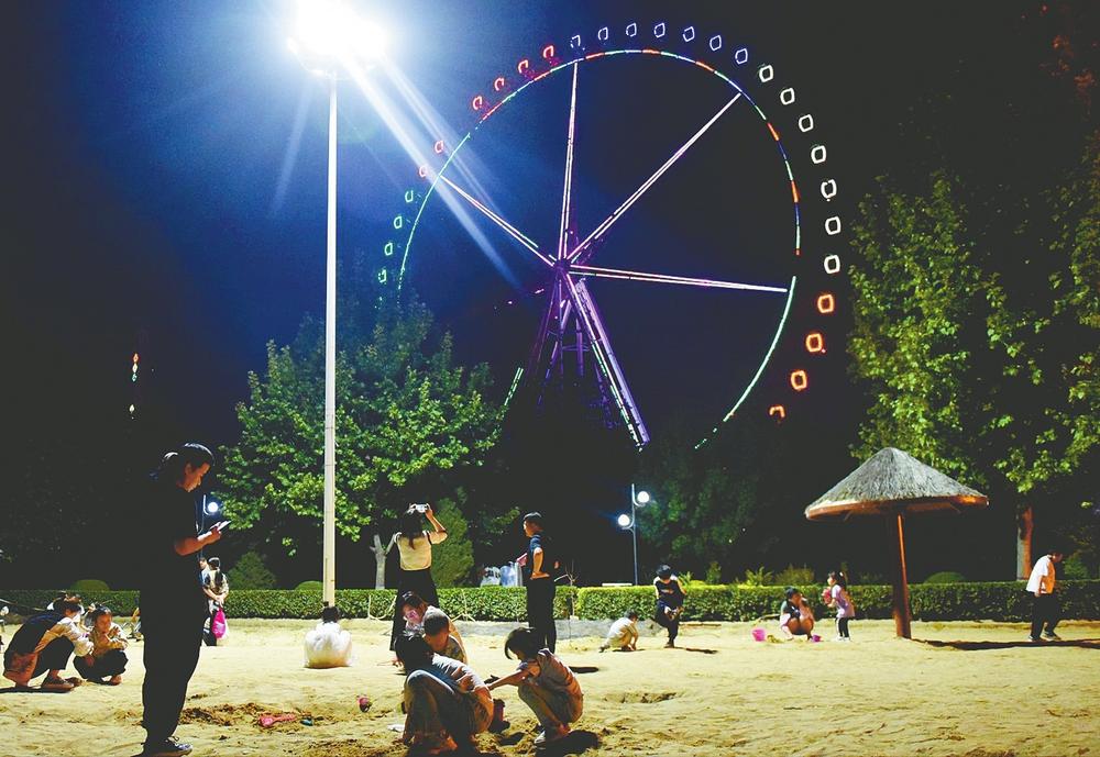 盛夏时节,七里河沙滩公园夜间灯光璀璨、微风阵阵,吸引了众多市民前来休闲、纳凉。(邢台新闻传媒中心记者叶晓强摄)