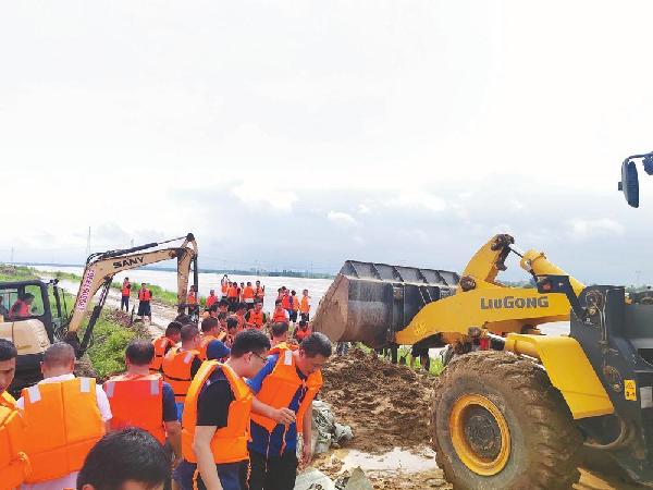留村街道办事处工作人员在对南澧河留村段加固堤坝。 (焦义敏摄)