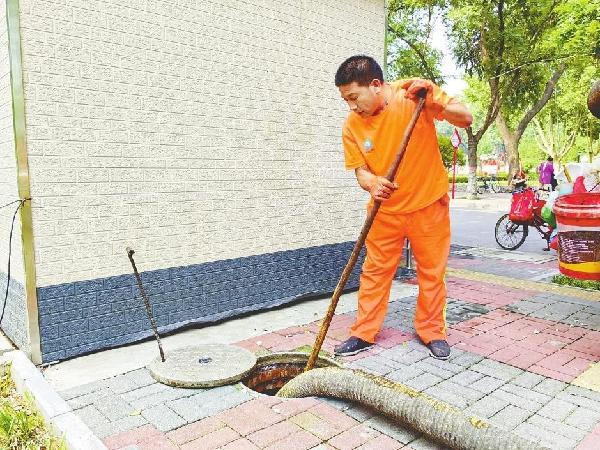 戴好胶皮手套,用钩子将化粪池井盖移走,检查池子里是否存有塑料袋、墩布头等杂物,再用自制铁挠钩从管内清理堵塞的垃圾,最后用吸粪车真空