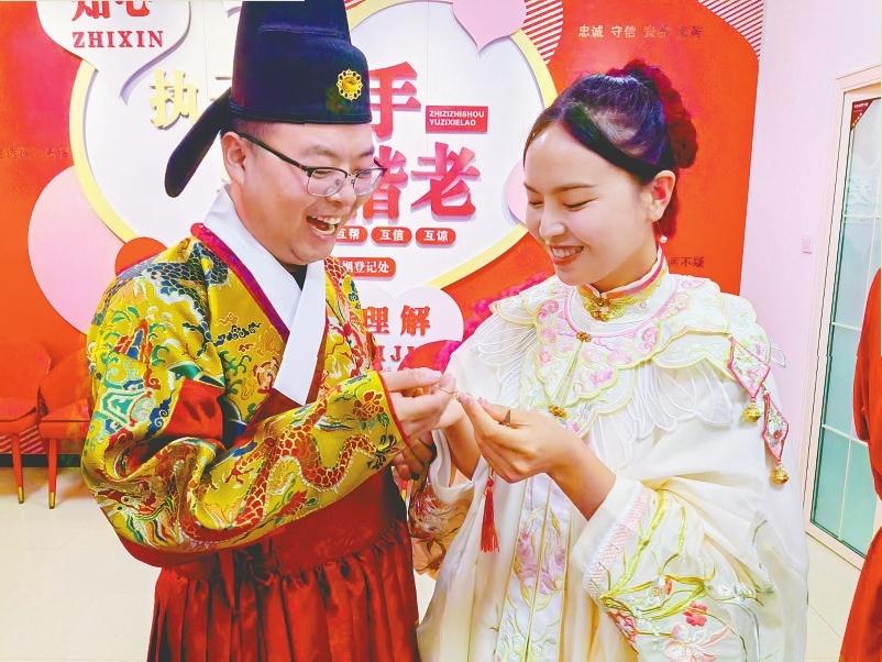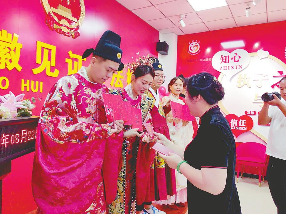 “癸卯年庚申月壬子日,依岁之证,以月之令,七夕颁证典礼正式开始……”昨日,在市经开区婚姻登记处,前来领证的新人身着传统汉服,在现场“司仪”的引导下完成领证,为这场爱的奔赴增添了一份浪漫的仪式感。