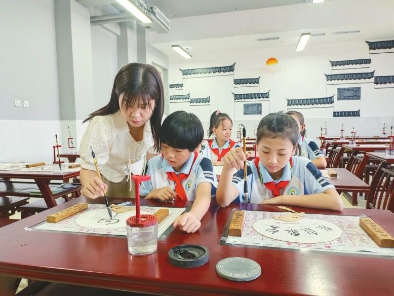 8月29日上午,市经开区东华路小学社团活动室内,孩子们在美术老师郑永凯的指导下,做工艺品写毛笔字。