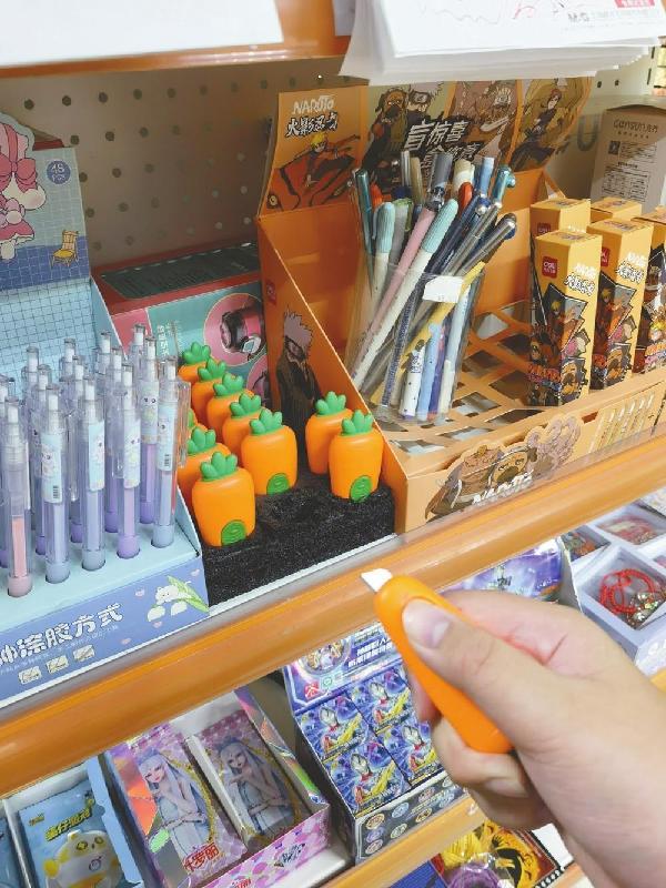 接着,记者来到中兴东大街附近另一家文具店,当询问店员是否有带刀的笔时,店员指了指一侧的货架说,“应该跟普通笔放在一起”。记者看到货架上,一支橙色的卡通笔在一堆普通笔中格外显眼,它的外包装上写着“萝卜笔刀”几个字。